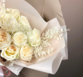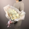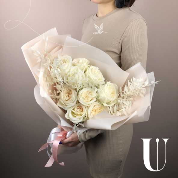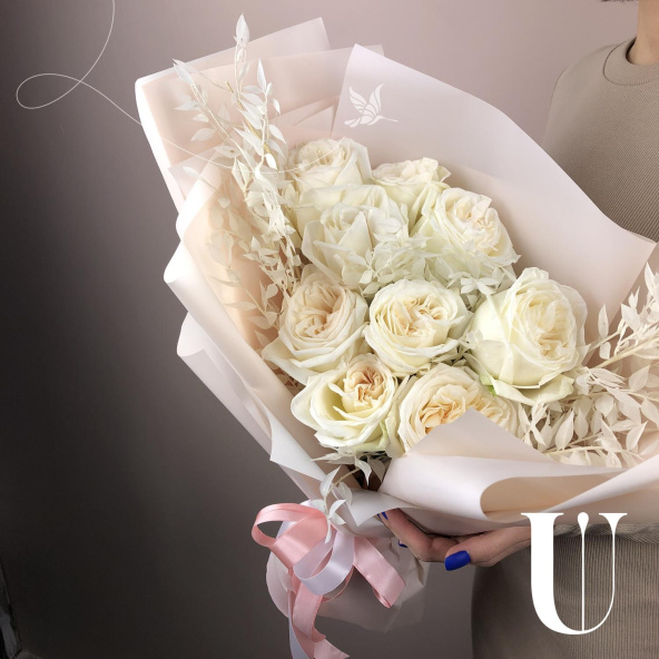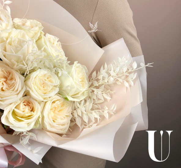 Нежные кустовые пионовидные розы в дизайнерской упаковке