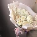 Букет из белых кустовых пионовидных роз сорта Бомбастик в упаковке