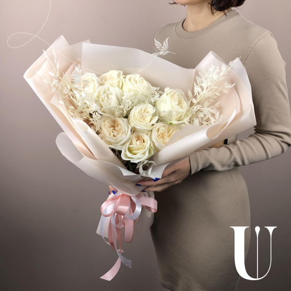 Монобукет из 11 роз Вайт Охара в розовой упаковке