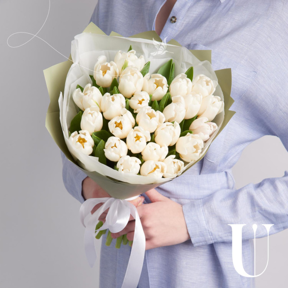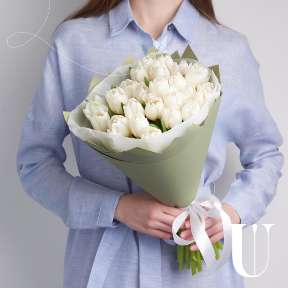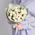 Стильный моно букет из 11 белых кустовых роз в дизайнерской упаковке