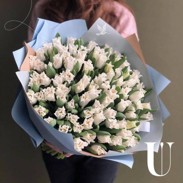 99 тюльпанов сорта «Поцелуйчик» в крафт бумаге