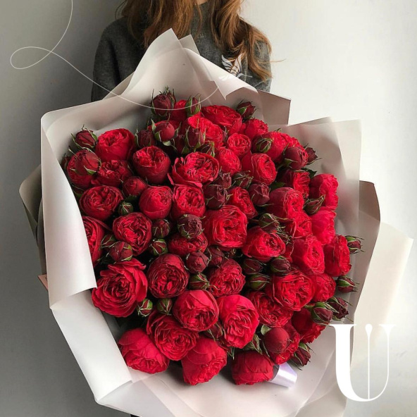 35 стеблей пионовидных роз Рэд Пиано в крафт бумаге и кальке