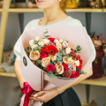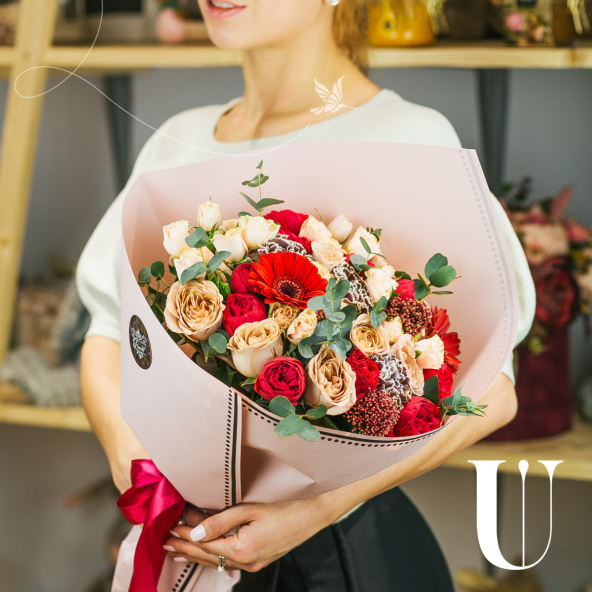 - Гермини-2шт. Роза кустовая-6шт. Роза одноголовая пионовидная-10шт. Диантус-3шт. Лента-1шт. Роза каппучино-7шт. Эвкалипт -1шт. Бумага крафт-1шт