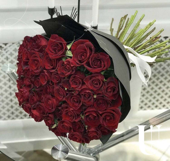 Букет из 49 шикарных эквадорских роз высотой 70 см. в стильном чёрном крафте!
