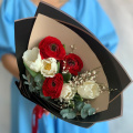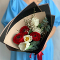 Монобукет из 9 красных кустовых роз сорта Мирабель в дизайнерской упаковке