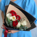 Букет из роз сорта Гран При и красных гербер в упаковке