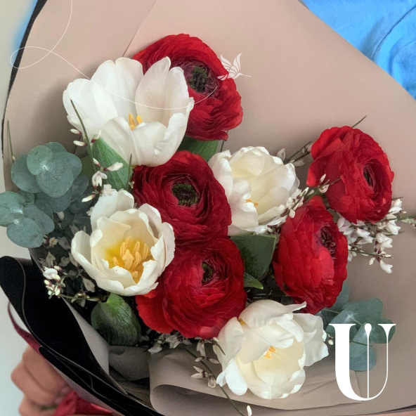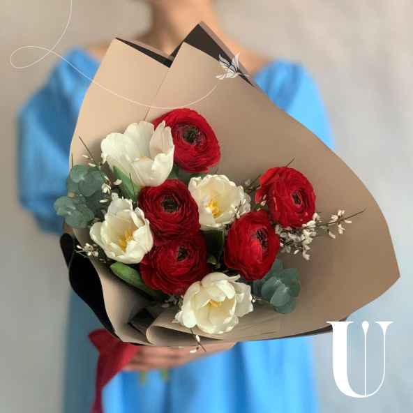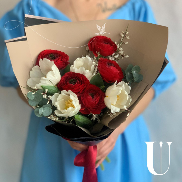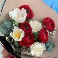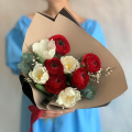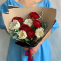 Романтическая композиция из красных роз и альстромерий в упаковке