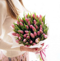 - Букет из 35 розовых тюльпанов. Букет упакован в корейскую пленку и перевязан атласными лентами