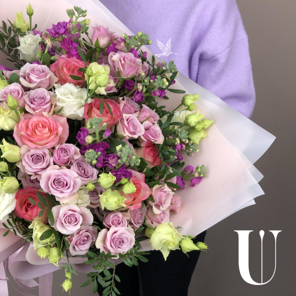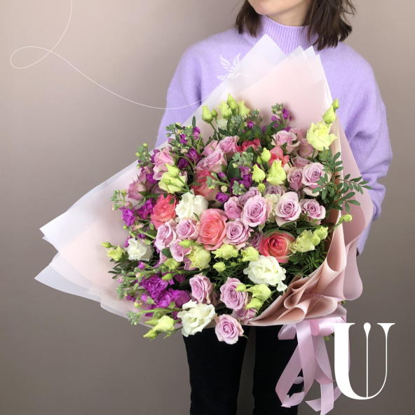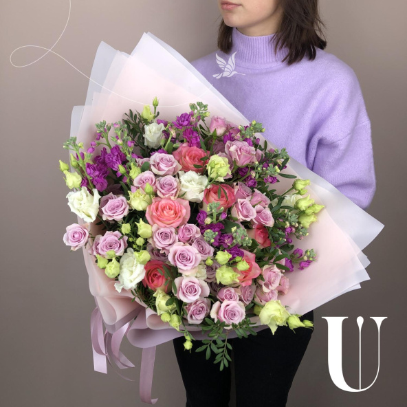 Ароматная маттиола в сочетании с розами и эустомой станет настоящим украшением праздника