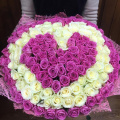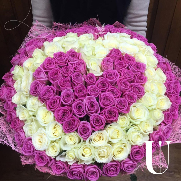 Монобукет из розовых и белых пионовидных роз в розовой упаковке