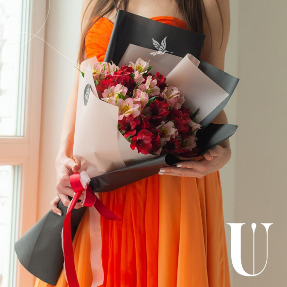 Букет из 11 альстромерий микс с зеленью в упаковке