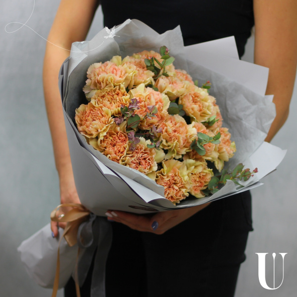 Букет из 15 кремовых гвоздик в стильной упаковке