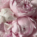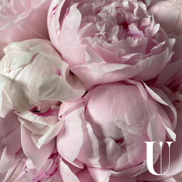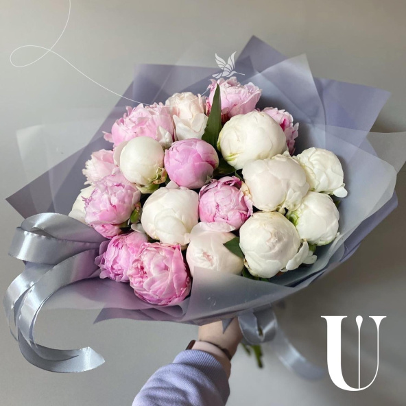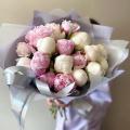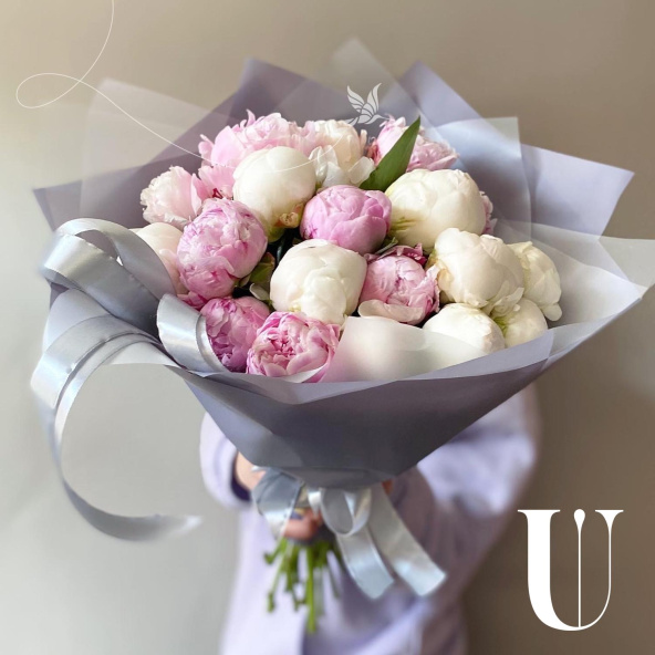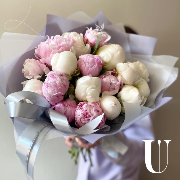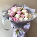 Микс из 19 белых и розовых пионов в крафт бумаге.