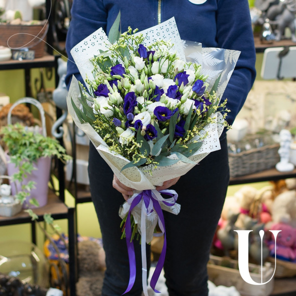 Букет из 10 белых эустом и белой гортензии в стильной упаковке
