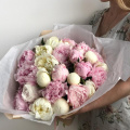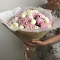 Букет из розовых кустовых пионовидных роз в упаковке