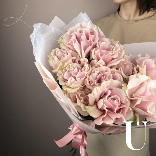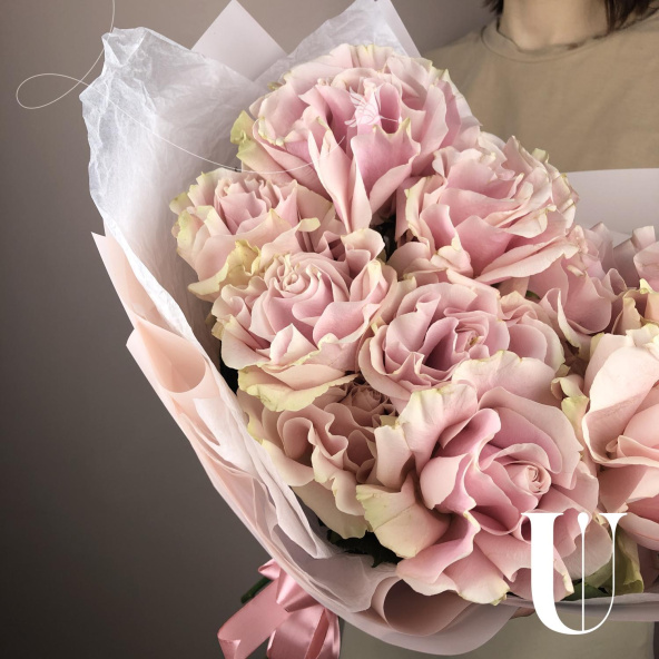 Монобукет из 19 розовых роз сорта Космик в упаковке тиффани