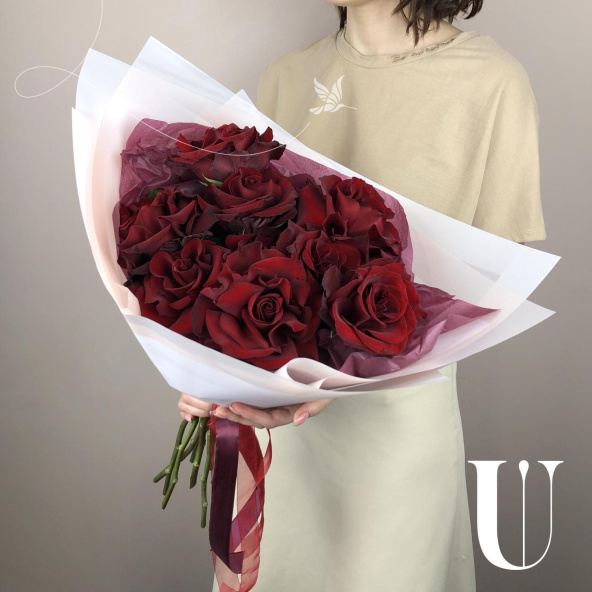 Монобукет из 9 роз сорта Пинк Охара в дизайнерской упаковке