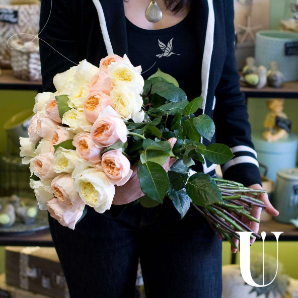 Большой букет из 51 кремовой розы сорта Шармант в дизайнерской упаковке