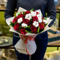 Романтическая композиция из красных роз и альстромерий в упаковке