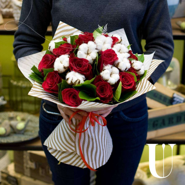 Монобукет из 15 вывернутых роз сорта Нина в матовой упаковке