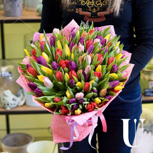 Монобукет из 101 тюльпана микс в розовой упаковке