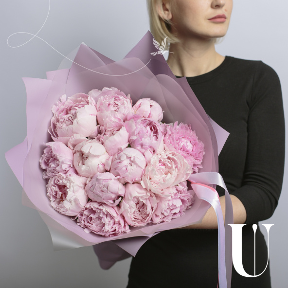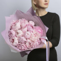 Букет из розовых пионов и фиолетовых гортензий в упаковке