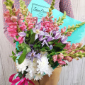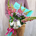 Монобукет из 21 диантуса и эвкалипта в розовой упаковке