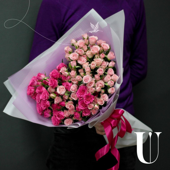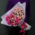 Монобукет из малиновых кустовых пионовидных роз в пленке