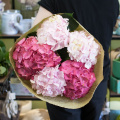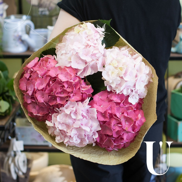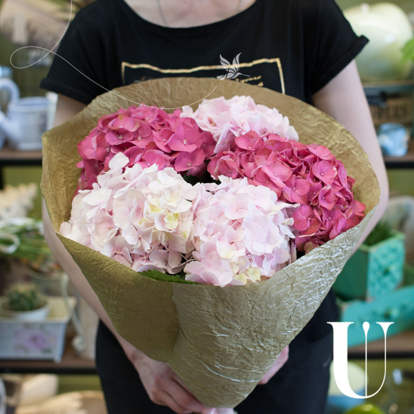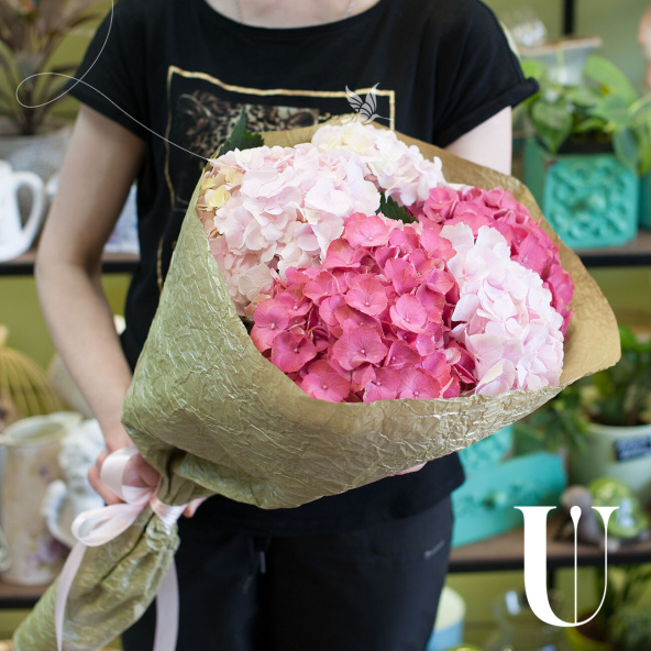 Монобукет из 7 розовых гортензий в дизайнерской упаковке