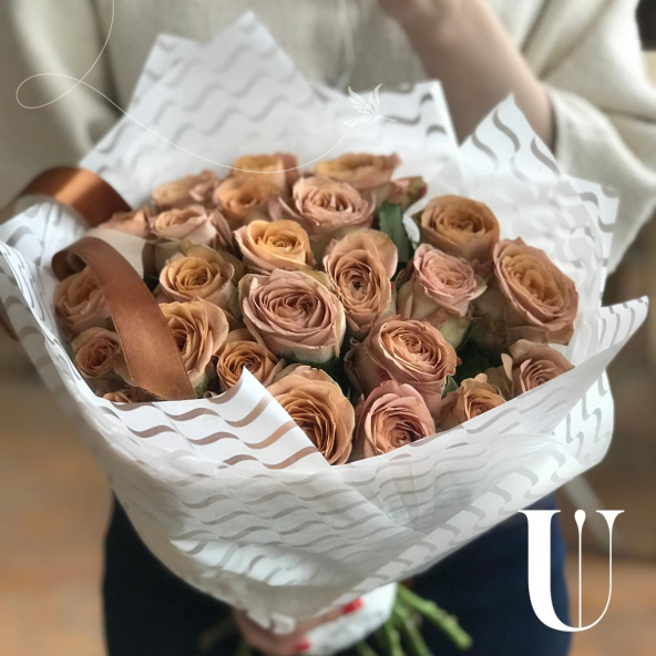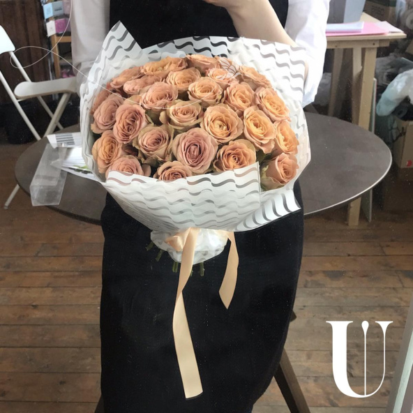 Монобукет из 25 роз сорта Аваланж в уматовой пленке
