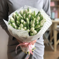 Букет из белых кустовых пионовидных роз сорта Бомбастик в упаковке