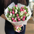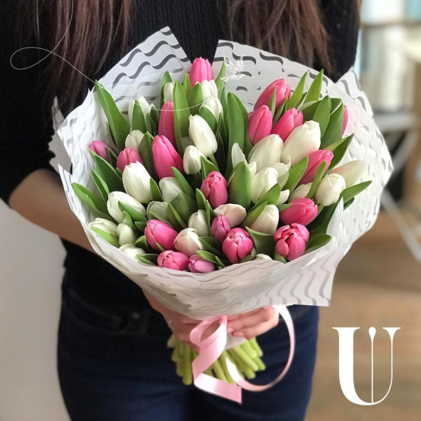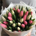 - Букет из 49 бело-розовых тюльпанов. Букет упакован в корейскую пленку и перевязан атласными лентами
