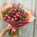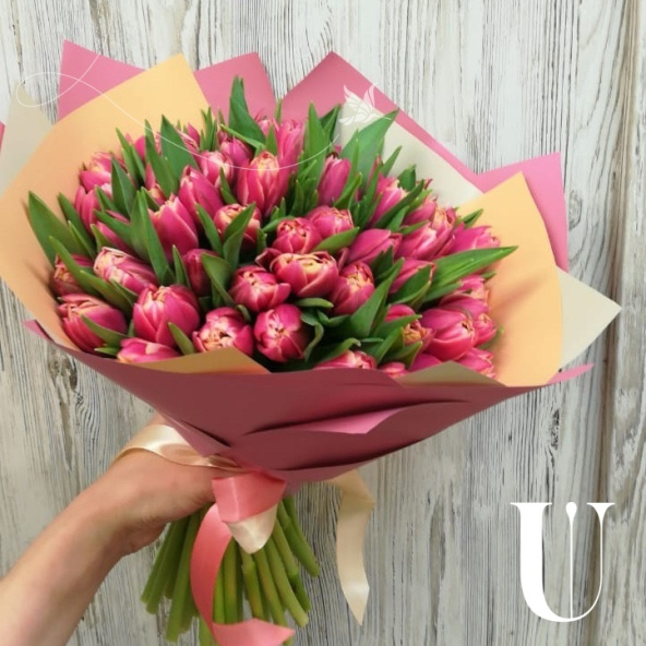 Монобукет из 49 розовых пионовидных тюльпанов в упаковке тиффани