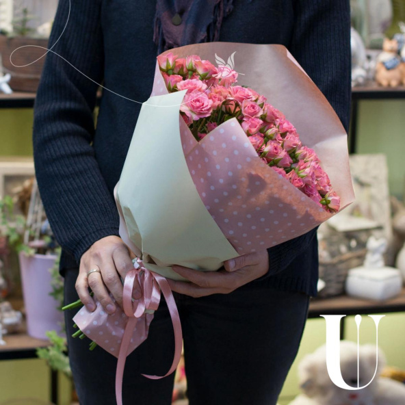 Букет из 9 кустовых роз Свит Сара 50 см в глянцевой пленке