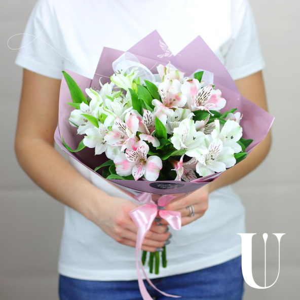 Монобукет из 15 альстромерий с зеленью в крафтовой упаковке