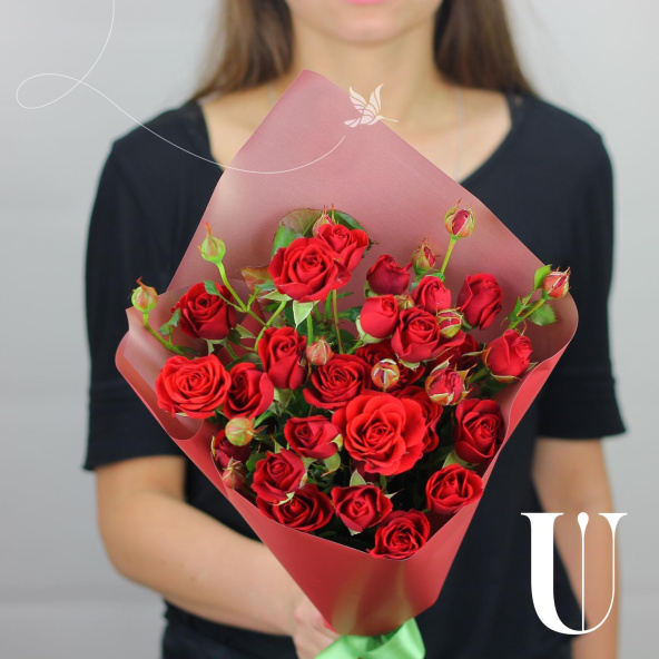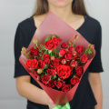 Монобукет из розовых кустовых роз сорта Лидия в упаковке