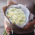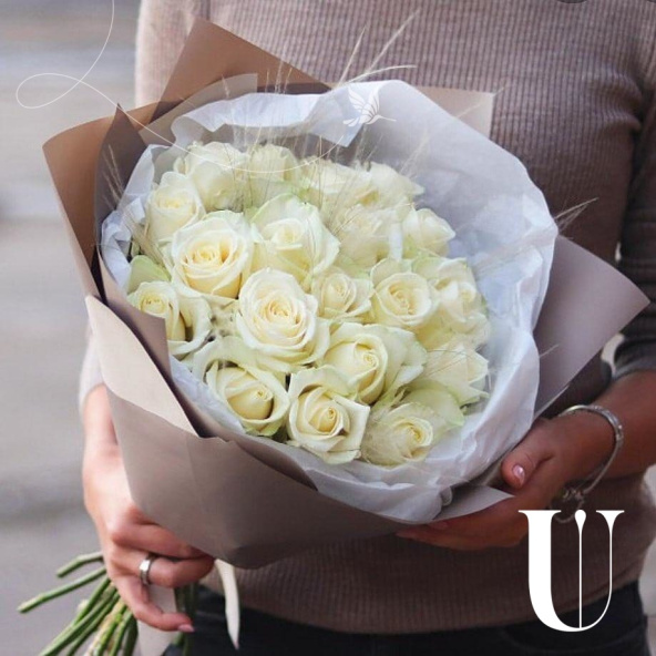 Монобукет из 25 жемчужных роз сорта Аваланж в матовой упаковке