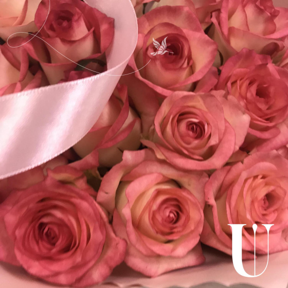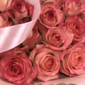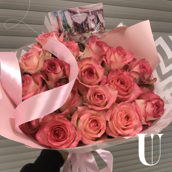 Красивый букет из стойких свежих роз нежно-розового оттенка в оригинальной упаковке (корейская плёнка), украшенный атласными лентами в цвет роз