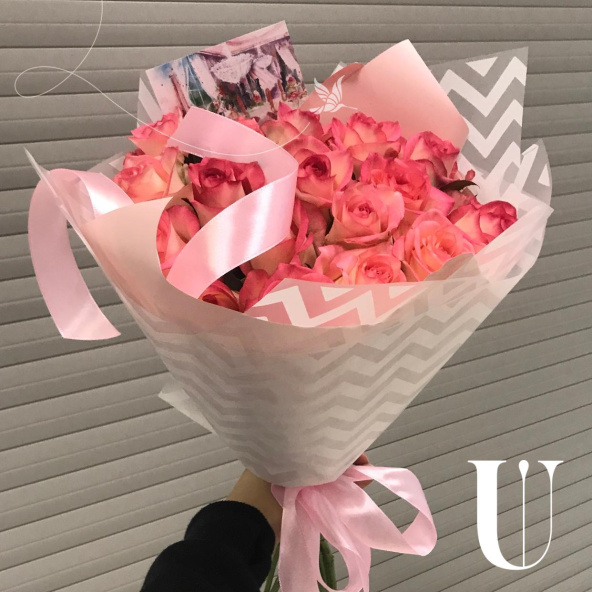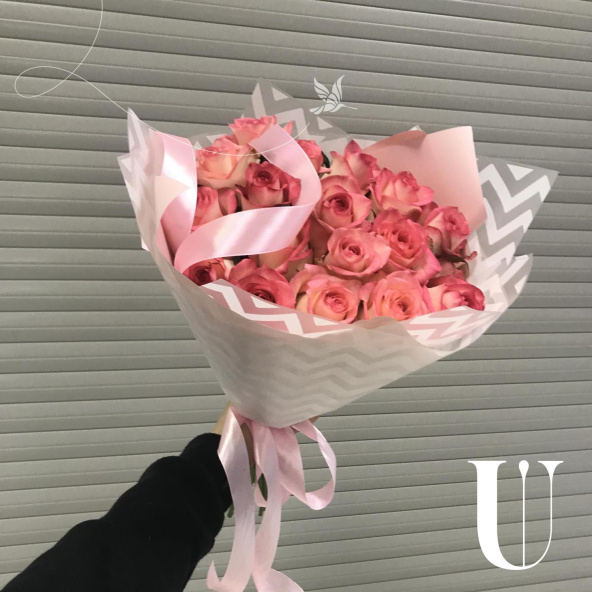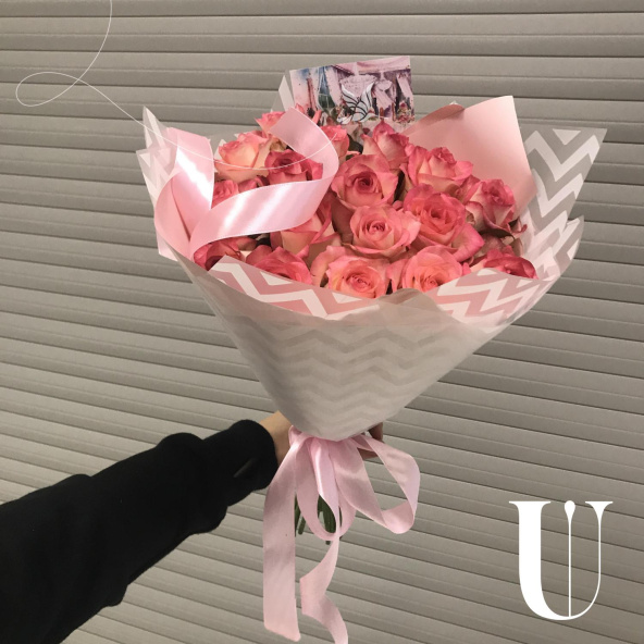 Монобукет из 25 роз микс в светло-розовой упаковке
