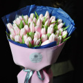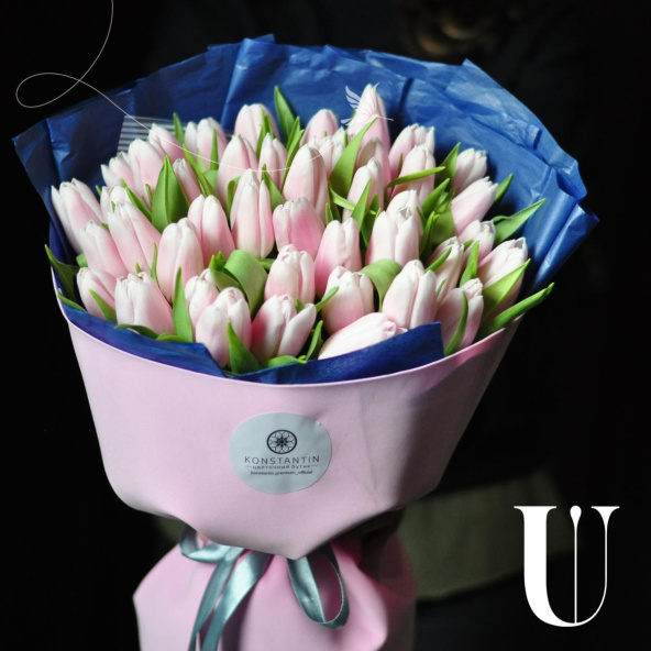 Тюльпаны 49 шт, дизайнерская упаковка, аква-ваза, транспортировочная коробка