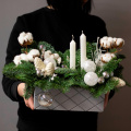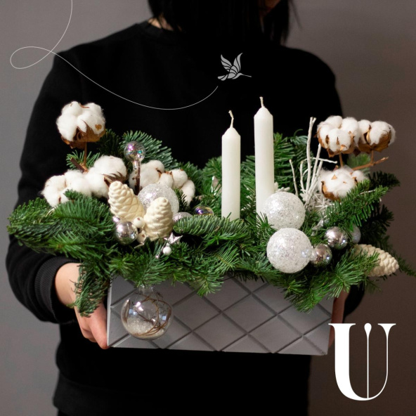 Две праздничные свечи в центре композиции согреют Ваших близких в волшебную новогоднюю ночь!