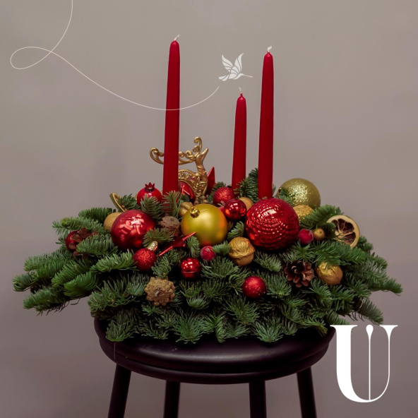 Две праздничные свечи в центре композиции согреют Ваших близких в волшебную новогоднюю ночь!