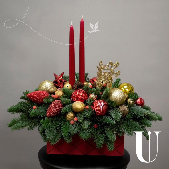 Две праздничные свечи в центре композиции согреют Ваших близких в волшебную новогоднюю ночь!