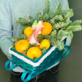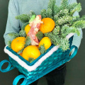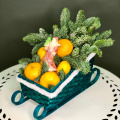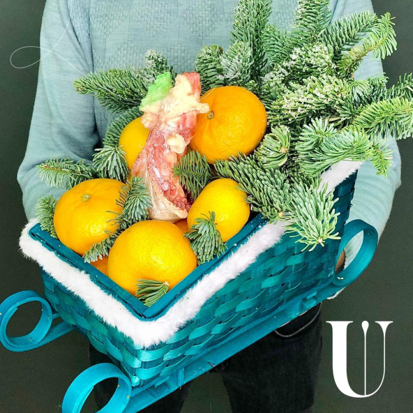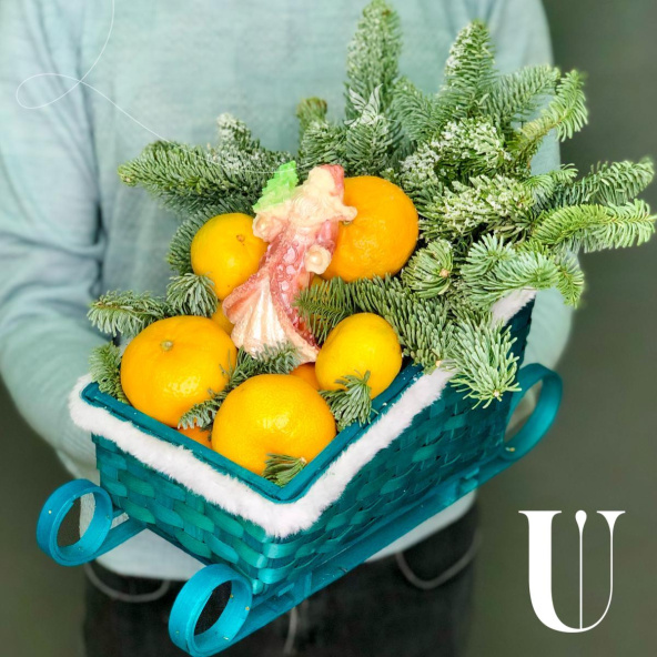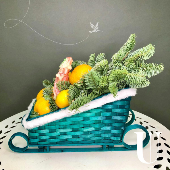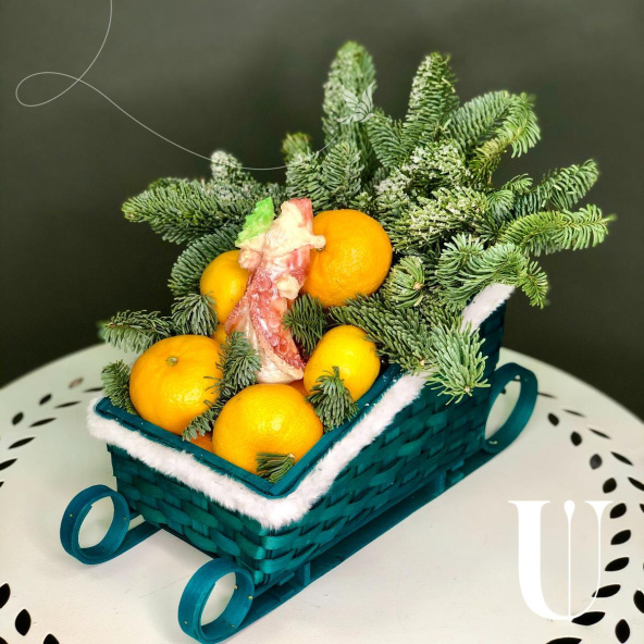 Лапник (нобилис), мандарины, шоколадный Дед мороз, флористическая губка, сани