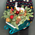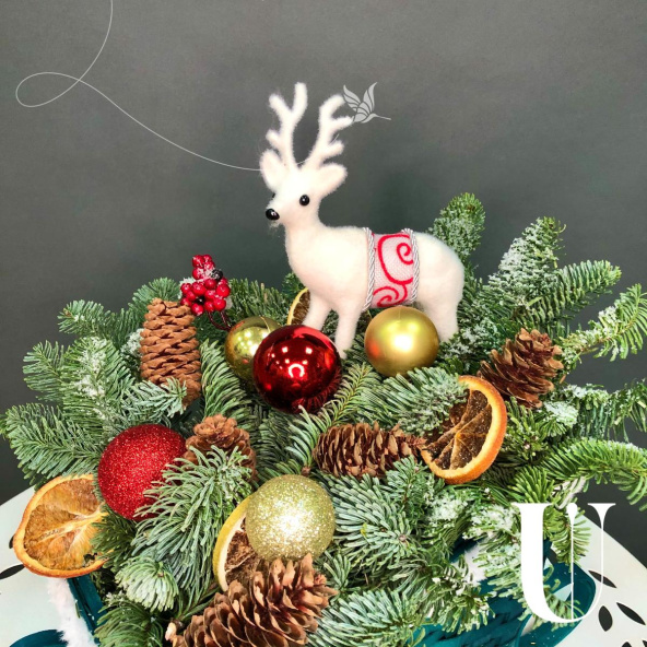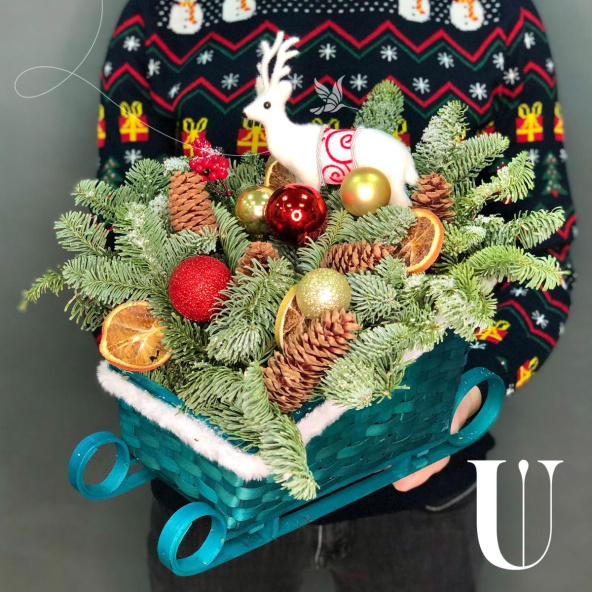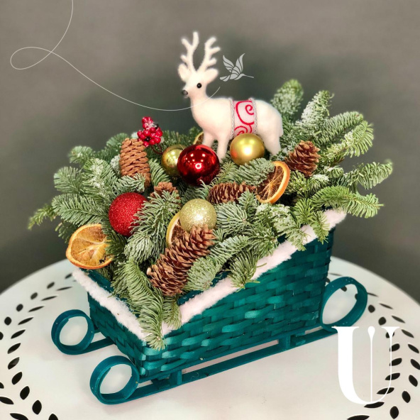 Лапник (нобилис), шары, декор, оленёнок, шишки, флористическая губка, сани