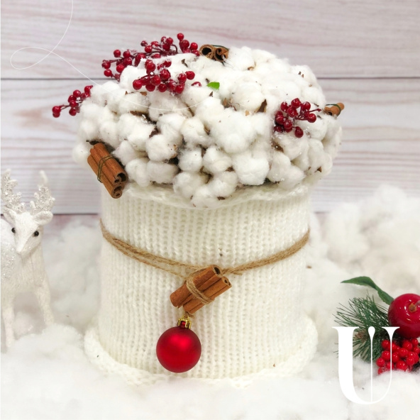 Хлопок, декоративные ягоды илекса, корица, декор, вязаный чехол, коробка 18х20 см