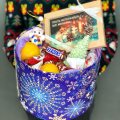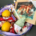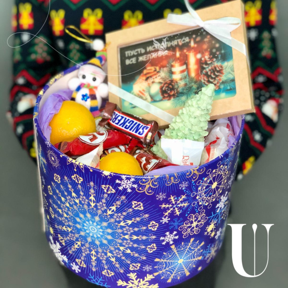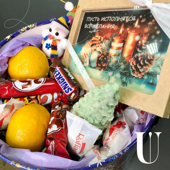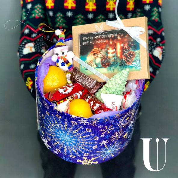 Конфеты, мандарины, шоколадная елка, шоколадная открытка, декор,шляпная коробка 25*20 см