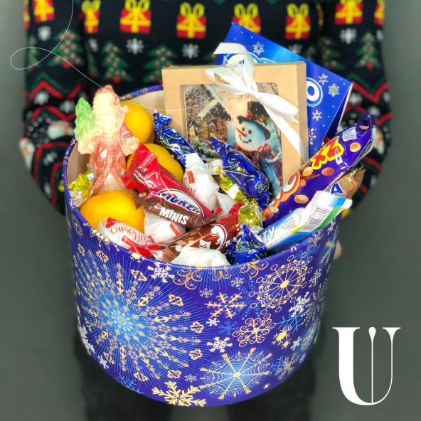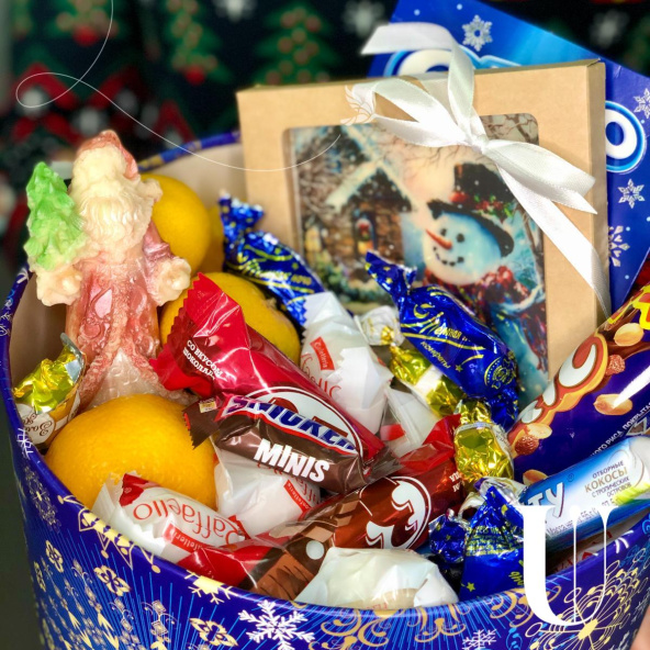 Конфеты, мандарины, шоколадный Дед Мороз, шоколадная открытка, печенье, декор,шляпная коробка 25*20 см