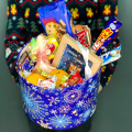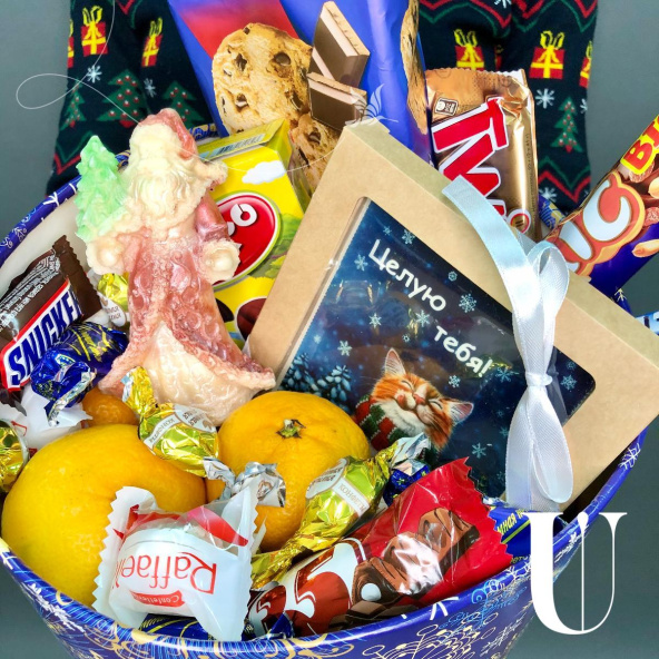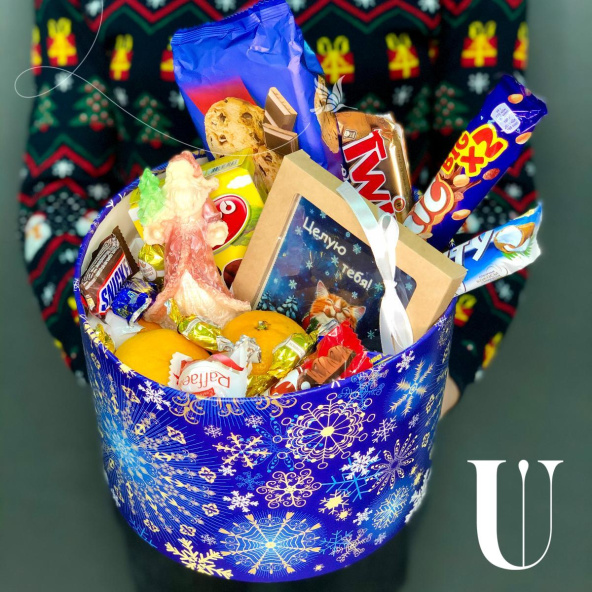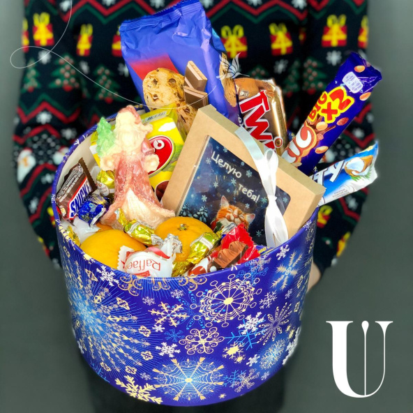 Конфеты, мандарины, шоколадный Дед Мороз, шоколадная открытка, печенье, декор,шляпная коробка 25*20 см