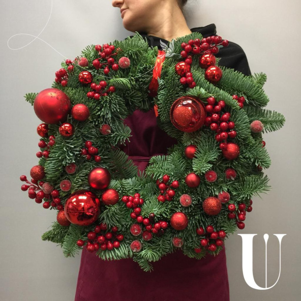- Украшен декоративными новогодними элементами. Диаметр 38-40 см. Имеет петельку. Не осыпается